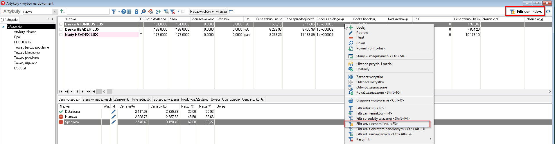 W tym celu powinien rozpocząć wystawianie dokumentu aby utworzyć kontekst tego kontrahenta, którego sprawdzamy. Następnie w oknie wyboru pozycji asortymentowej wybieramy filtr F3 lub filtr z menu prawego przycisku myszy.