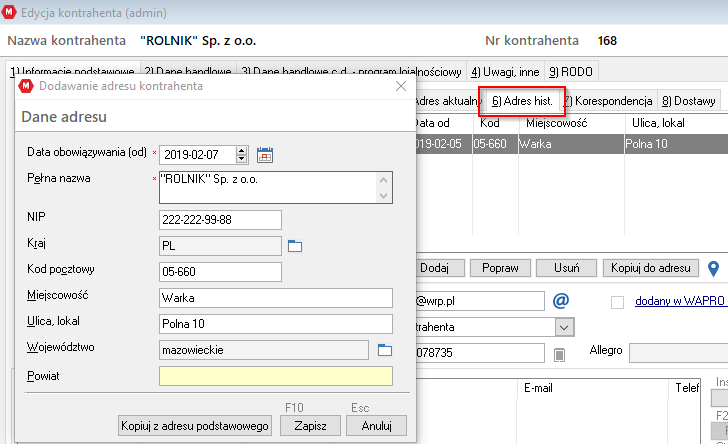 Tworzenie adresu historycznego jest bardzo proste. Pierwsza możliwość to bardzo szybkie skopiowanie adresu poprzez przycisk Kopiuj do historii. Druga możliwość to wejście do zakładki 6) Adres hist. i dodanie ręcznie adresu. Historia adresu bazuje na dacie obowiązywania OD. W praktyce podajemy po prostu od kiedy dany adres obowiązuje. System w momencie drukowania dokumentu sięga do historii i pobiera odpowiedni adres względem daty wystawienia dokumentu. W oknie dodawania adresu historycznego jest też opcja Kopiuj z adresu podstawowego. Pozwala ona na szybkie skopiowanie jeśli nie zrobiło się tego z poziomu zakładki z adresem podstawowym. Obydwie opcje oczywiście dostępne są w edycji kontrahenta.
