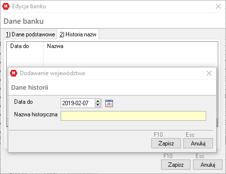 Banki wykonują fuzje co rodzi potrzebę rozszerzenia tej logiki o historię banków. W związku z faktem, że niektóre marki zmieniają nazwy i dane powinny w tym zakresie również drukować się poprawnie na dokumencie. Rozwiązaliśmy ten przypadek wersji systemu do fakturowania WAPRO Mag – wprowadzono możliwość tworzenia historycznych nazw. Opcja dostępna jest w menu Kartoteki | Banki | Popraw | 2) Historia nazw.